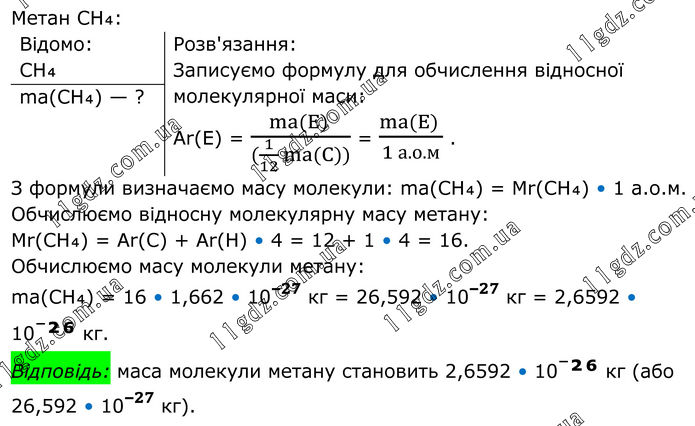 Метан CH₄: Відомо: CH₄ Розв'язання: Записуємо формулу для обчислення відносної молекулярної маси: Ar(E) = (ma(E) )/((1/12 ma(C))) = (ma(E) )/(1 а.о.м) . ma(CH₄) — ? З формули визначаємо масу молекули: ma(CH₄) = Mr(CH₄) • 1 а.о.м. Обчислюємо відносну молекулярну масу метану: Mr(CH₄) = Ar(C) + Ar(H) • 4 = 12 + 1 • 4 = 16. Обчислюємо масу молекули метану: ma(CH₄) = 16 • 1,662 • 10⁻²⁷ кг = 26,592 • 10⁻²⁷ кг = 2,6592 • 10⁻²⁶ кг. Відповідь: маса молекули метану становить 2,6592 • 10⁻²⁶ кг (або 26,592 • 10⁻²⁷ кг).