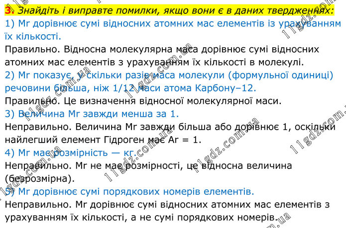 3. Знайдіть і виправте помилки, якщо вони є в даних твердженнях: 1) Mr дорівнює сумі відносних атомних мас елементів із урахуванням їх кількості. Правильно. Відносна молекулярна маса дорівнює сумі відносних атомних мас елементів з урахуванням їх кількості в молекулі. 2) Mr показує, у скільки разів маса молекули (формульної одиниці) речовини більша, ніж 1/12 маси атома Карбону–12. Правильно. Це визначення відносної молекулярної маси. 3) Величина Mr завжди менша за 1. Неправильно. Величина Mr завжди більша або дорівнює 1, оскільки найлегший елемент Гідроген має Ar = 1. 4) Mr має розмірність — кг. Неправильно. Mr не має розмірності, це відносна величина (безрозмірна). 5) Mr дорівнює сумі порядкових номерів елементів. Неправильно. Mr дорівнює сумі відносних атомних мас елементів з урахуванням їх кількості, а не сумі порядкових номерів.