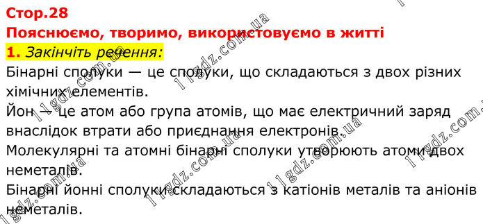 Пояснюємо, творимо, використовуємо в житті 1. Закінчіть речення: Бінарні сполуки — це сполуки, що складаються з двох різних хімічних елементів. Йон — це атом або група атомів, що має електричний заряд внаслідок втрати або приєднання електронів. Молекулярні та атомні бінарні сполуки утворюють атоми двох неметалів. Бінарні йонні сполуки складаються з катіонів металів та аніонів неметалів.