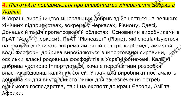 4. Підготуйте повідомлення про виробництво мінеральних добрив в Україні. В Україні виробництво мінеральних добрив здійснюється на великих хімічних підприємствах, зокрема у Черкасах, Рівному, Одесі, Донецькій та Дніпропетровській областях. Основними виробниками є ПрАТ "Азот" (Черкаси), ПрАТ "Рівнеазот" (Рівне), які спеціалізуються на азотних добривах, зокрема аміачній селітрі, карбаміді, аміачній воді. Фосфорні добрива виробляються з імпортованої сировини, оскільки власні родовища фосфоритів в Україні обмежені. Калійні добрива частково імпортуються, хоча є перспективи розробки власних родовищ калійних солей. Українські виробники постачають добрива як для внутрішнього ринку для забезпечення потреб сільського господарства, так і на експорт до країн Європи, Азії та Африки.