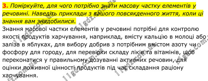 3. Поміркуйте, для чого потрібно знати масову частку елементів у речовині. Наведіть приклади з вашого повсякденного життя, коли ці знання вам знадобилися. Знання масової частки елементів у речовині потрібні для контролю якості продуктів харчування, наприклад, вмісту кальцію в молоці або заліза в яблуках, для вибору добрив з потрібним вмістом азоту чи фосфору для городу, для перевірки складу ліків та вітамінів, щоб переконатися у правильному дозуванні активних речовин, для оцінки поживної цінності продуктів під час складання раціону харчування.