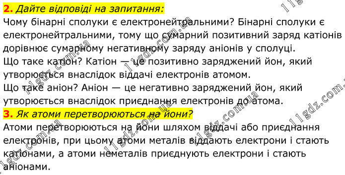 2. Дайте відповіді на запитання: Чому бінарні сполуки є електронейтральними? Бінарні сполуки є електронейтральними, тому що сумарний позитивний заряд катіонів дорівнює сумарному негативному заряду аніонів у сполуці. Що таке катіон? Катіон — це позитивно заряджений йон, який утворюється внаслідок віддачі електронів атомом. Що таке аніон? Аніон — це негативно заряджений йон, який утворюється внаслідок приєднання електронів до атома. 3. Як атоми перетворюються на йони? Атоми перетворюються на йони шляхом віддачі або приєднання електронів, при цьому атоми металів віддають електрони і стають катіонами, а атоми неметалів приєднують електрони і стають аніонами.