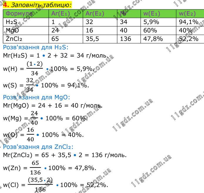 4. Заповніть таблицю: Формула Ar(E₁) Ar(E₂) Mr w(E₁) w(E₂) H₂S 1 32 34 5,9% 94,1% MgO 24 16 40 60% 40% ZnCl₂ 65 35,5 136 47,8% 52,2% Розв'язання для H₂S: Mr(H₂S) = 1 • 2 + 32 = 34 г/моль. w(H) = ((1 • 2))/34 • 100% = 5,9%. w(S) = 32/34 • 100% = 94,1%. Розв'язання для MgO: Mr(MgO) = 24 + 16 = 40 г/моль. w(Mg) = 24/40 • 100% = 60%. w(O) = 16/40 • 100% = 40%. Розв'язання для ZnCl₂: Mr(ZnCl₂) = 65 + 35,5 • 2 = 136 г/моль. w(Zn) = 65/136 • 100% = 47,8%. w(Cl) = ((35,5 • 2))/136 • 100% = 52,2%.