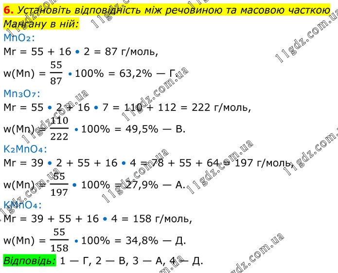 6. Установіть відповідність між речовиною та масовою часткою Мангану в ній: MnO₂: Mr = 55 + 16 • 2 = 87 г/моль, w(Mn) = 55/87 • 100% = 63,2% — Г. Mn₃O₇: Mr = 55 • 2 + 16 • 7 = 110 + 112 = 222 г/моль, w(Mn) = 110/222 • 100% = 49,5% — В. K₂MnO₄: Mr = 39 • 2 + 55 + 16 • 4 = 78 + 55 + 64 = 197 г/моль, w(Mn) = 55/197 • 100% = 27,9% — А. KMnO₄: Mr = 39 + 55 + 16 • 4 = 158 г/моль, w(Mn) = 55/158 • 100% = 34,8% — Д. Відповідь: 1 — Г, 2 — В, 3 — А, 4 — Д.