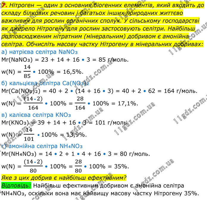 7. Нітроген — один з основних біогенних елементів, який входить до складу білкових речовин і багатьох інших природних життєво важливих для рослин органічних сполук. У сільському господарстві як джерело Нітрогену для рослин застосовують селітри. Найбільш розповсюдженим нітратним (мінеральним) добривом є амонійна селітра. Обчисліть масову частку Нітрогену в мінеральних добривах: а) натрієва селітра NaNO₃ Mr(NaNO₃) = 23 + 14 + 16 • 3 = 85 г/моль. w(N) = 14/85 • 100% = 16,5%. б) кальцієва селітра Ca(NO₃)₂ Mr(Ca(NO₃)₂) = 40 + 2 • (14 + 16 • 3) = 40 + 2 • 62 = 164 г/моль. w(N) = ((14 • 2))/164 • 100% = 28/164 • 100% = 17,1%. в) калієва селітра KNO₃ Mr(KNO₃) = 39 + 14 + 16 • 3 = 101 г/моль. w(N) = 14/101 • 100% = 13,9%. г) амонійна селітра NH₄NO₃ Mr(NH₄NO₃) = 14 • 2 + 1 • 4 + 16 • 3 = 80 г/моль. w(N) = ((14 • 2))/80 • 100% = 28/80 • 100% = 35%. Яке з цих добрив є найбільш ефективним? Найбільш ефективним добривом є амонійна селітра NH₄NO₃, оскільки вона має найвищу масову частку Нітрогену 35%.
