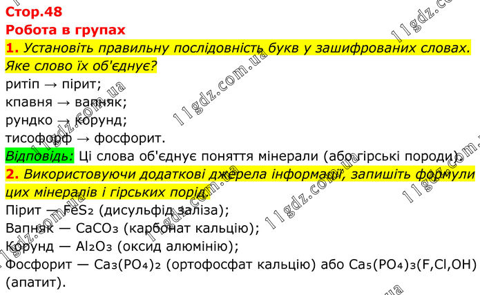 Робота в групах 1. Установіть правильну послідовність букв у зашифрованих словах. Яке слово їх об'єднує? ритіп → пірит; кпавня → вапняк; рундко → корунд; тисофорф → фосфорит. Відповідь: Ці слова об'єднує поняття мінерали (або гірські породи). 2. Використовуючи додаткові джерела інформації, запишіть формули цих мінералів і гірських порід. Пірит — FeS₂ (дисульфід заліза); Вапняк — CaCO₃ (карбонат кальцію); Корунд — Al₂O₃ (оксид алюмінію); Фосфорит — Ca₃(PO₄)₂ (ортофосфат кальцію) або Ca₅(PO₄)₃(F,Cl,OH) (апатит).