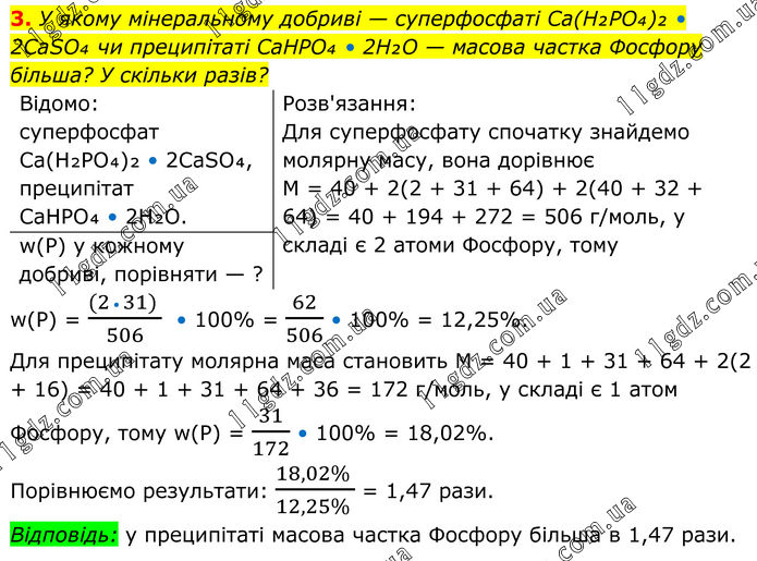 3. У якому мінеральному добриві — суперфосфаті Ca(H₂PO₄)₂ • 2CaSO₄ чи преципітаті CaHPO₄ • 2H₂O — масова частка Фосфору більша? У скільки разів? Відомо: суперфосфат Ca(H₂PO₄)₂ • 2CaSO₄, преципітат CaHPO₄ • 2H₂O. Розв'язання: Для суперфосфату спочатку знайдемо молярну масу, вона дорівнює M = 40 + 2(2 + 31 + 64) + 2(40 + 32 + 64) = 40 + 194 + 272 = 506 г/моль, у складі є 2 атоми Фосфору, тому w(P) у кожному добриві, порівняти — ? w(P) = ((2 • 31) )/506 • 100% = 62/506 • 100% = 12,25%. Для преципітату молярна маса становить M = 40 + 1 + 31 + 64 + 2(2 + 16) = 40 + 1 + 31 + 64 + 36 = 172 г/моль, у складі є 1 атом Фосфору, тому w(P) = 31/172 • 100% = 18,02%. Порівнюємо результати: (18,02% )/(12,25% ) = 1,47 рази. Відповідь: у преципітаті масова частка Фосфору більша в 1,47 рази.