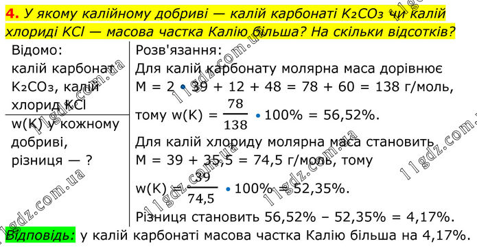 4. У якому калійному добриві — калій карбонаті K₂CO₃ чи калій хлориді KCl — масова частка Калію більша? На скільки відсотків? Відомо: калій карбонат K₂CO₃, калій хлорид KCl Розв'язання: Для калій карбонату молярна маса дорівнює M = 2 • 39 + 12 + 48 = 78 + 60 = 138 г/моль, тому w(K) = 78/138 • 100% = 56,52%. Для калій хлориду молярна маса становить M = 39 + 35,5 = 74,5 г/моль, тому w(K) = 39/(74,5 ) • 100% = 52,35%. Різниця становить 56,52% – 52,35% = 4,17%. w(K) у кожному добриві, різниця — ? Відповідь: у калій карбонаті масова частка Калію більша на 4,17%.