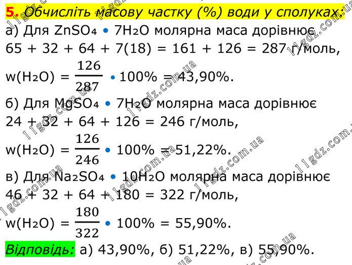 5. Обчисліть масову частку (%) води у сполуках: а) Для ZnSO₄ • 7H₂O молярна маса дорівнює 65 + 32 + 64 + 7(18) = 161 + 126 = 287 г/моль, w(H₂O) = 126/(287 ) • 100% = 43,90%. б) Для MgSO₄ • 7H₂O молярна маса дорівнює 24 + 32 + 64 + 126 = 246 г/моль, w(H₂O) = 126/246 • 100% = 51,22%. в) Для Na₂SO₄ • 10H₂O молярна маса дорівнює 46 + 32 + 64 + 180 = 322 г/моль, w(H₂O) = 180/322 • 100% = 55,90%. Відповідь: а) 43,90%, б) 51,22%, в) 55,90%.