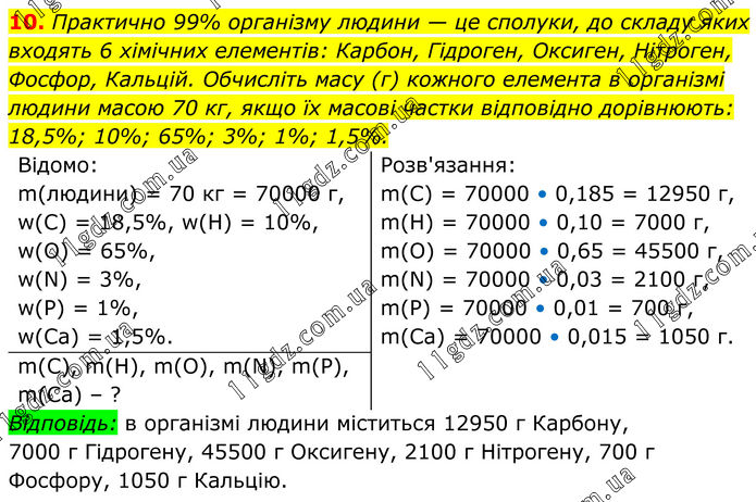 10. Практично 99% організму людини — це сполуки, до складу яких входять 6 хімічних елементів: Карбон, Гідроген, Оксиген, Нітроген, Фосфор, Кальцій. Обчисліть масу (г) кожного елемента в організмі людини масою 70 кг, якщо їх масові частки відповідно дорівнюють: 18,5%; 10%; 65%; 3%; 1%; 1,5%. Відомо: m(людини) = 70 кг = 70000 г, w(C) = 18,5%, w(H) = 10%, w(O) = 65%, w(N) = 3%, w(P) = 1%, w(Ca) = 1,5%. Розв'язання: m(C) = 70000 • 0,185 = 12950 г, m(H) = 70000 • 0,10 = 7000 г, m(O) = 70000 • 0,65 = 45500 г, m(N) = 70000 • 0,03 = 2100 г, m(P) = 70000 • 0,01 = 700 г, m(Ca) = 70000 • 0,015 = 1050 г. m(C), m(H), m(O), m(N), m(P), m(Ca) – ? Відповідь: в організмі людини міститься 12950 г Карбону, 7000 г Гідрогену, 45500 г Оксигену, 2100 г Нітрогену, 700 г Фосфору, 1050 г Кальцію.