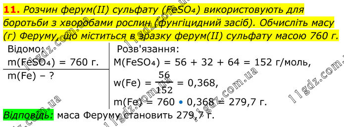 11. Розчин ферум(ІІ) сульфату (FeSO₄) використовують для боротьби з хворобами рослин (фунгіцидний засіб). Обчисліть масу (г) Феруму, що міститься в зразку ферум(ІІ) сульфату масою 760 г. Відомо: m(FeSO₄) = 760 г. Розв'язання: M(FeSO₄) = 56 + 32 + 64 = 152 г/моль, w(Fe) = 56/152 = 0,368, m(Fe) = 760 • 0,368 = 279,7 г. m(Fe) – ? Відповідь: маса Феруму становить 279,7 г.