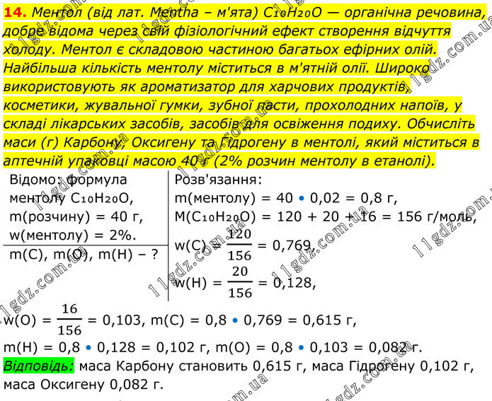 14. Ментол (від лат. Mentha – м'ята) C₁₀H₂₀O — органічна речовина, добре відома через свій фізіологічний ефект створення відчуття холоду. Ментол є складовою частиною багатьох ефірних олій. Найбільша кількість ментолу міститься в м'ятній олії. Широко використовують як ароматизатор для харчових продуктів, косметики, жувальної гумки, зубної пасти, прохолодних напоїв, у складі лікарських засобів, засобів для освіження подиху. Обчисліть маси (г) Карбону, Оксигену та Гідрогену в ментолі, який міститься в аптечній упаковці масою 40 г (2% розчин ментолу в етанолі). Відомо: формула ментолу C₁₀H₂₀O, m(розчину) = 40 г, w(ментолу) = 2%. Розв'язання: m(ментолу) = 40 • 0,02 = 0,8 г, M(C₁₀H₂₀O) = 120 + 20 + 16 = 156 г/моль, w(C) = 120/156 = 0,769, w(H) = 20/156 = 0,128, m(C), m(O), m(H) – ? w(O) = 16/156 = 0,103, m(C) = 0,8 • 0,769 = 0,615 г, m(H) = 0,8 • 0,128 = 0,102 г, m(O) = 0,8 • 0,103 = 0,082 г. Відповідь: маса Карбону становить 0,615 г, маса Гідрогену 0,102 г, маса Оксигену 0,082 г.
