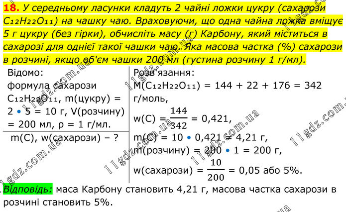 18. У середньому ласунки кладуть 2 чайні ложки цукру (сахарози C₁₂H₂₂O₁₁) на чашку чаю. Враховуючи, що одна чайна ложка вміщує 5 г цукру (без гірки), обчисліть масу (г) Карбону, який міститься в сахарозі для однієї такої чашки чаю. Яка масова частка (%) сахарози в розчині, якщо об'єм чашки 200 мл (густина розчину 1 г/мл). Відомо: формула сахарози C₁₂H₂₂O₁₁, m(цукру) = 2 • 5 = 10 г, V(розчину) = 200 мл, ρ = 1 г/мл. Розв'язання: M(C₁₂H₂₂O₁₁) = 144 + 22 + 176 = 342 г/моль, w(C) = 144/342 = 0,421, m(C) = 10 • 0,421 = 4,21 г, m(розчину) = 200 • 1 = 200 г, w(сахарози) = 10/200 = 0,05 або 5%. m(C), w(сахарози) – ? Відповідь: маса Карбону становить 4,21 г, масова частка сахарози в розчині становить 5%.
