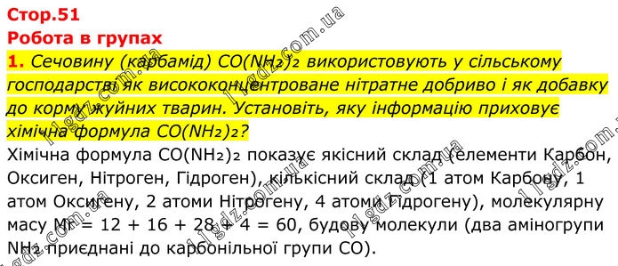 Робота в групах 1. Сечовину (карбамід) CO(NH₂)₂ використовують у сільському господарстві як висококонцентроване нітратне добриво і як добавку до корму жуйних тварин. Установіть, яку інформацію приховує хімічна формула CO(NH₂)₂? Хімічна формула CO(NH₂)₂ показує якісний склад (елементи Карбон, Оксиген, Нітроген, Гідроген), кількісний склад (1 атом Карбону, 1 атом Оксигену, 2 атоми Нітрогену, 4 атоми Гідрогену), молекулярну масу Mr = 12 + 16 + 28 + 4 = 60, будову молекули (два аміногрупи NH₂ приєднані до карбонільної групи CO).
