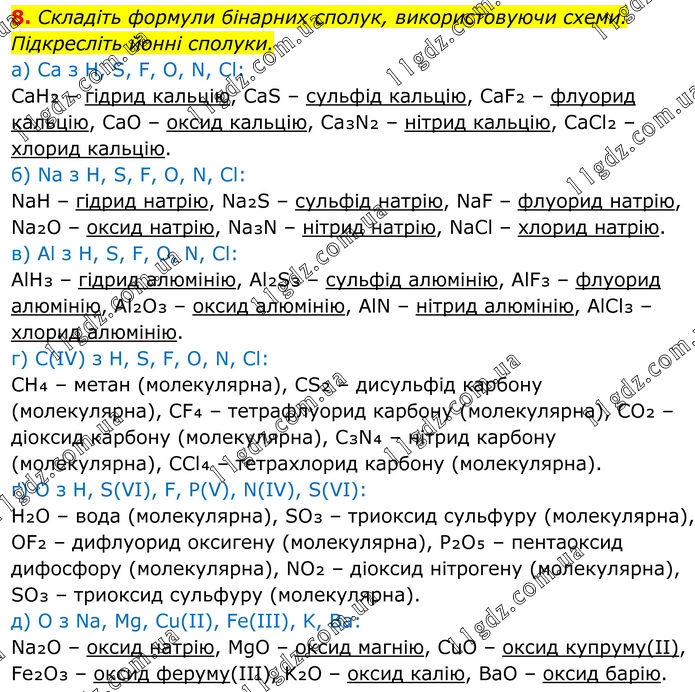 8. Складіть формули бінарних сполук, використовуючи схеми. Підкресліть йонні сполуки. а) Ca з H, S, F, O, N, Cl: CaH₂ – гідрид кальцію, CaS – сульфід кальцію, CaF₂ – флуорид кальцію, CaO – оксид кальцію, Ca₃N₂ – нітрид кальцію, CaCl₂ – хлорид кальцію. б) Na з H, S, F, O, N, Cl: NaH – гідрид натрію, Na₂S – сульфід натрію, NaF – флуорид натрію, Na₂O – оксид натрію, Na₃N – нітрид натрію, NaCl – хлорид натрію. в) Al з H, S, F, O, N, Cl: AlH₃ – гідрид алюмінію, Al₂S₃ – сульфід алюмінію, AlF₃ – флуорид алюмінію, Al₂O₃ – оксид алюмінію, AlN – нітрид алюмінію, AlCl₃ – хлорид алюмінію. г) C(IV) з H, S, F, O, N, Cl: CH₄ – метан (молекулярна), CS₂ – дисульфід карбону (молекулярна), CF₄ – тетрафлуорид карбону (молекулярна), CO₂ – діоксид карбону (молекулярна), C₃N₄ – нітрид карбону (молекулярна), CCl₄ – тетрахлорид карбону (молекулярна). ґ) O з H, S(VI), F, P(V), N(IV), S(VI): H₂O – вода (молекулярна), SO₃ – триоксид сульфуру (молекулярна), OF₂ – дифлуорид оксигену (молекулярна), P₂O₅ – пентаоксид дифосфору (молекулярна), NO₂ – діоксид нітрогену (молекулярна), SO₃ – триоксид сульфуру (молекулярна). д) O з Na, Mg, Cu(II), Fe(III), K, Ba: Na₂O – оксид натрію, MgO – оксид магнію, CuO – оксид купруму(II), Fe₂O₃ – оксид феруму(III), K₂O – оксид калію, BaO – оксид барію.