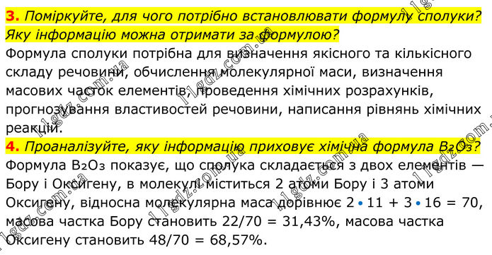 3. Поміркуйте, для чого потрібно встановлювати формулу сполуки? Яку інформацію можна отримати за формулою? Формула сполуки потрібна для визначення якісного та кількісного складу речовини, обчислення молекулярної маси, визначення масових часток елементів, проведення хімічних розрахунків, прогнозування властивостей речовини, написання рівнянь хімічних реакцій. 4. Проаналізуйте, яку інформацію приховує хімічна формула B₂O₃? Формула B₂O₃ показує, що сполука складається з двох елементів — Бору і Оксигену, в молекулі міститься 2 атоми Бору і 3 атоми Оксигену, відносна молекулярна маса дорівнює 2 • 11 + 3 • 16 = 70, масова частка Бору становить 22/70 = 31,43%, масова частка Оксигену становить 48/70 = 68,57%.