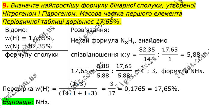 9. Визначте найпростішу формулу бінарної сполуки, утвореної Нітрогеном і Гідрогеном. Масова частка першого елемента Періодичної таблиці дорівнює 17,65%. Відомо: w(H) = 17,65%, w(N) = 82,35% Розв'язання: Нехай формула NₓHᵧ, знайдемо співвідношення x:y = 82,35/14 : 17,65/1 = 5,88 : 17,65 = 5,88/5,88 : 17,65/5,88 = 1 : 3, формула NH₃. формулу сполуки Перевірка w(H) = ((1 • 3))/((14 • 1 + 1 • 3)) = 3/17 = 0,1765 = 17,65%. Відповідь: NH₃.