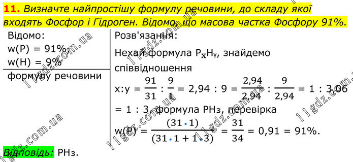 11. Визначте найпростішу формулу речовини, до складу якої входять Фосфор і Гідроген. Відомо, що масова частка Фосфору 91%. Відомо: w(P) = 91%, w(H) = 9% Розв'язання: Нехай формула PₓHᵧ, знайдемо співвідношення x:y = 91/31 : 9/1 = 2,94 : 9 = 2,94/(2,94 ) : 9/2,94 = 1 : 3,06 = 1 : 3, формула PH₃, перевірка w(P) = ((31 • 1))/((31 • 1 + 1 • 3)) = 31/34 = 0,91 = 91%. формулу речовини Відповідь: PH₃.