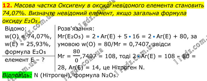 12. Масова частка Оксигену в оксиді невідомого елемента становить 74,07%. Визначте невідомий елемент, якщо загальна формула оксиду E₂O₅. Відомо: w(O) = 74,07%, w(E) = 25,93%, формула E₂O₅ Розв'язання: Mr(E₂O₅) = 2 • Ar(E) + 5 • 16 = 2 • Ar(E) + 80, за умовою w(O) = 80/Mr = 0,7407, звідси Mr = 80/0,7407 = 108, тоді 2 • Ar(E) = 108 – 80 = 28, Ar(E) = 14, це Нітроген N. елемент E – ? Відповідь: N (Нітроген), формула N₂O₅.