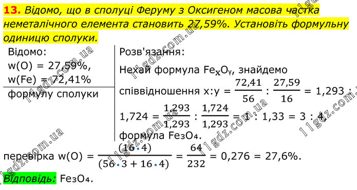 13. Відомо, що в сполуці Феруму з Оксигеном масова частка неметалічного елемента становить 27,59%. Установіть формульну одиницю сполуки. Відомо: w(O) = 27,59%, w(Fe) = 72,41% Розв'язання: Нехай формула FeₓOᵧ, знайдемо співвідношення x:y = 72,41/56 : 27,59/16 = 1,293 : 1,724 = 1,293/1,293 : 1,724/1,293 = 1 : 1,33 = 3 : 4, формула Fe₃O₄. формулу сполуки перевірка w(O) = ((16 • 4))/((56 • 3 + 16 • 4) ) = 64/232 = 0,276 = 27,6%. Відповідь: Fe₃O₄.