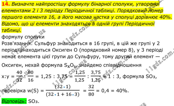 14. Визначте найпростішу формулу бінарної сполуки, утвореної елементами 2 і 3 періоду Періодичної таблиці. Порядковий номер першого елемента 16, а його масова частка у сполуці дорівнює 40%. Відомо, що ці елементи знаходяться в одній групі Періодичної таблиці. Розв'язання: Сульфур знаходиться в 16 групі, в цій же групі у 2 періоді знаходиться Оксиген O (порядковий номер 8), у 3 періоді немає елемента цієї групи до Сульфуру, тому другий елемент — Оксиген, нехай формула SₓOᵧ, знайдемо співвідношення x:y = 40/32 : 60/16 = 1,25 : 3,75 = 1,25/(1,25 ) : 3,75/1,25 = 1 : 3, формула SO₃, перевірка w(S) = ((32 • 1))/((32 • 1 + 16 • 3)) = 32/80 = 0,4 = 40%. Відповідь: SO₃.
