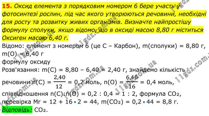 15. Оксид елемента з порядковим номером 6 бере участь у фотосинтезі рослин, під час якого утворюються речовини, необхідні для росту та розвитку живих організмів. Визначте найпростішу формулу сполуки, якщо відомо, що в оксиді масою 8,80 г міститься Оксиген масою 6,40 г. Відомо: елемент з номером 6 (це C – Карбон), m(сполуки) = 8,80 г, m(O) = 6,40 г формулу оксиду Розв'язання: m(C) = 8,80 – 6,40 = 2,40 г, знайдемо кількість речовини n(C) = 2,40/(12 ) = 0,2 моль, n(O) = 6,40/16 = 0,4 моль, співвідношення n(C):n(O) = 0,2 : 0,4 = 1 : 2, формула CO₂, перевірка Mr = 12 + 16 • 2 = 44, m(CO₂) = 0,2 • 44 = 8,8 г. Відповідь: CO₂.