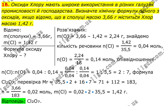 16. Оксиди Хлору мають широке використання в різних галузях промисловості й господарства. Визначте хімічну формулу одного з оксидів, якщо відомо, що в сполуці масою 3,66 г міститься Хлор масою 1,42 г. Відомо: m(сполуки) = 3,66г, m(Cl) = 1,42 г Розв'язання: m(O) = 3,66 – 1,42 = 2,24 г, знайдемо кількість речовини n(Cl) = 1,42/(35,5 ) = 0,04 моль, n(O) = 2,24/16 = 0,14 моль, співвідношення Формула оксиду Хлору – ? n(Cl):n(O) = 0,04 : 0,14 = 0,04/0,04 : 0,14/0,04 = 1 : 3,5 = 2 : 7, формула Cl₂O₇, перевірка Mr = 35,5 • 2 + 16 • 7 = 71 + 112 = 183, n = 3,66/(183 ) = 0,02 моль, m(Cl) = 0,02 • 2 • 35,5 = 1,42 г. Відповідь: Cl₂O₇.
