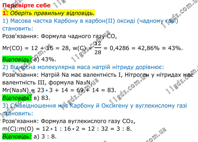 Перевірте себе 1. Оберіть правильну відповідь. 1) Масова частка Карбону в карбон(ІІ) оксиді (чадному газі) становить: Розв'язання: Формула чадного газу CO, Mr(CO) = 12 + 16 = 28, w(C) = 12/28 = 0,4286 = 42,86% ≈ 43%. Відповідь: а) 43%. 2) Відносна молекулярна маса натрій нітриду дорівнює: Розв'язання: Натрій Na має валентність І, Нітроген у нітридах має валентність ІІІ, формула Na₃N, Mr(Na₃N) = 23 • 3 + 14 = 69 + 14 = 83. Відповідь: в) 83. 3) Співвідношення мас Карбону й Оксигену у вуглекислому газі становить: Розв'язання: Формула вуглекислого газу CO₂, m(C):m(O) = 12 • 1 : 16 • 2 = 12 : 32 = 3 : 8. Відповідь: а) 3 : 8.