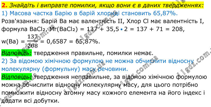 2. Знайдіть і виправте помилки, якщо вони є в даних твердженнях: 1) Масова частка Барію в барій хлориді становить 65,87%. Розв'язання: Барій Ba має валентність ІІ, Хлор Cl має валентність І, формула BaCl₂, Mr(BaCl₂) = 137 + 35,5 • 2 = 137 + 71 = 208, w(Ba) = 137/208 = 0,6587 = 65,87%. Відповідь: твердження правильне, помилки немає. 2) За відомою хімічною формулою не можна обчислити відносну молекулярну (формульну) масу речовини. Відповідь: твердження неправильне, за відомою хімічною формулою можна обчислити відносну молекулярну масу, для цього потрібно помножити відносну атомну масу кожного елемента на його індекс і додати всі добутки.