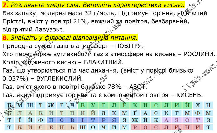 7. Розгляньте хмару слів. Випишіть характеристики кисню. Без запаху, молярна маса 32 г/моль, підтримує горіння, відкритий Прістлі, вміст у повітрі 21%, важчий за повітря, безбарвний, відкритий Лавуазьє. 8. Знайдіть у філворді відповіді на питання. Природна суміш газів в атмосфері – ПОВІТРЯ. Хто перетворює вуглекислий газ з атмосфери на кисень – РОСЛИНИ. Колір зрідженого кисню – БЛАКИТНИЙ. Газ, що утворюється під час дихання, (вміст у повітрі близько 0,037%) – ВУГЛЕКИСЛИЙ. Газ, вміст якого в повітрі близько 78% – АЗОТ. Газ, який підтримує горіння та є компонентом повітря – КИСЕНЬ.