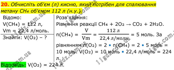 20. Обчисліть об'єм (л) кисню, який потрібен для спалювання метану CH₄ об'ємом 112 л (н.у.). Відомо: V(CH₄) = 112 л, Vm = 22,4 л/моль. Розв'язання: Рівняння реакції CH₄ + 2O₂ → CO₂ + 2H₂O. n(CH₄) = V/(Vm ) = (112 л )/( 22,4 л/моль ) = 5 моль. За рівнянням n(O₂) = 2 • n(CH₄) = 2 • 5 моль = 10 моль. V(O₂) = 10 моль • 22,4 л/моль = 224 л. Знайти: V(O₂) – ? Відповідь: V(O₂) = 224 л.