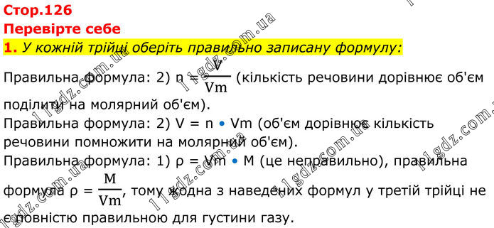 Перевірте себе 1. У кожній трійці оберіть правильно записану формулу: Правильна формула: 2) n = V/(Vm ) (кількість речовини дорівнює об'єм поділити на молярний об'єм). Правильна формула: 2) V = n • Vm (об'єм дорівнює кількість речовини помножити на молярний об'єм). Правильна формула: 1) ρ = Vm • M (це неправильно), правильна формула ρ = M/Vm, тому жодна з наведених формул у третій трійці не є повністю правильною для густини газу.