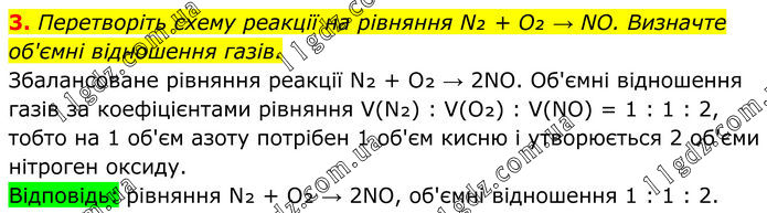 3. Перетворіть схему реакції на рівняння N₂ + O₂ → NO. Визначте об'ємні відношення газів. Збалансоване рівняння реакції N₂ + O₂ → 2NO. Об'ємні відношення газів за коефіцієнтами рівняння V(N₂) : V(O₂) : V(NO) = 1 : 1 : 2, тобто на 1 об'єм азоту потрібен 1 об'єм кисню і утворюється 2 об'єми нітроген оксиду. Відповідь: рівняння N₂ + O₂ → 2NO, об'ємні відношення 1 : 1 : 2.