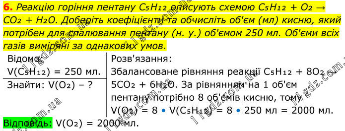 6. Реакцію горіння пентану C₅H₁₂ описують схемою C₅H₁₂ + O₂ → CO₂ + H₂O. Доберіть коефіцієнти та обчисліть об'єм (мл) кисню, який потрібен для спалювання пентану (н. у.) об'ємом 250 мл. Об'єми всіх газів виміряні за однакових умов. Відомо: V(C₅H₁₂) = 250 мл. Розв'язання: Збалансоване рівняння реакції C₅H₁₂ + 8O₂ → 5CO₂ + 6H₂O. За рівнянням на 1 об'єм пентану потрібно 8 об'ємів кисню, тому V(O₂) = 8 • V(C₅H₁₂) = 8 • 250 мл = 2000 мл. Знайти: V(O₂) – ? Відповідь: V(O₂) = 2000 мл.