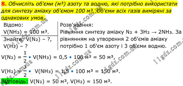 8. Обчисліть об'єми (м³) азоту та водню, які потрібно використати для синтезу аміаку об'ємом 100 м³. Об'єми всіх газів виміряні за однакових умов. Відомо: V(NH₃) = 100 м³. Розв'язання: Рівняння синтезу аміаку N₂ + 3H₂ → 2NH₃. За рівнянням на утворення 2 об'ємів аміаку потрібно 1 об'єм азоту і 3 об'єми водню. Знайти: V(N₂) – ?, V(H₂) – ? V(N₂) = 1/2 • V(NH₃) = 0,5 • 100 м³ = 50 м³, V(H₂) = 3/2 • V(NH₃) = 1,5 • 100 м³ = 150 м³. Відповідь: V(N₂) = 50 м³, V(H₂) = 150 м³.