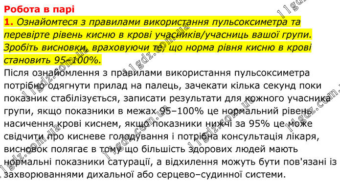 Робота в парі 1. Ознайомтеся з правилами використання пульсоксиметра та перевірте рівень кисню в крові учасників/учасниць вашої групи. Зробіть висновки, враховуючи те, що норма рівня кисню в крові становить 95–100%. Після ознайомлення з правилами використання пульсоксиметра потрібно одягнути прилад на палець, зачекати кілька секунд поки показник стабілізується, записати результати для кожного учасника групи, якщо показники в межах 95–100% це нормальний рівень насичення крові киснем, якщо показники нижчі за 95% це може свідчити про кисневе голодування і потрібна консультація лікаря, висновок полягає в тому що більшість здорових людей мають нормальні показники сатурації, а відхилення можуть бути пов'язані із захворюваннями дихальної або серцево–судинної системи.