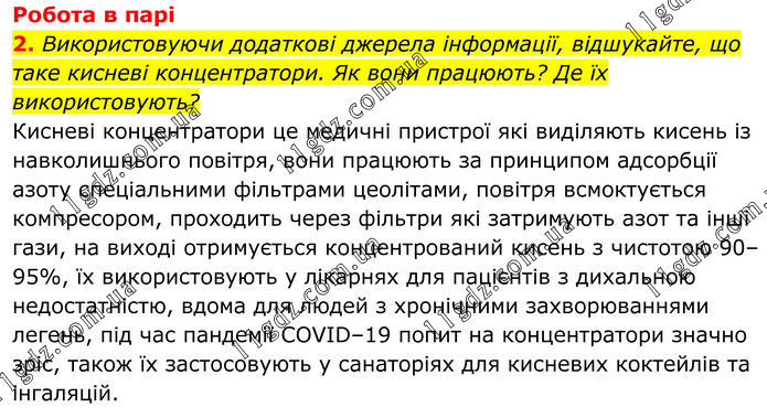 Робота в парі 2. Використовуючи додаткові джерела інформації, відшукайте, що таке кисневі концентратори. Як вони працюють? Де їх використовують? Кисневі концентратори це медичні пристрої які виділяють кисень із навколишнього повітря, вони працюють за принципом адсорбції азоту спеціальними фільтрами цеолітами, повітря всмоктується компресором, проходить через фільтри які затримують азот та інші гази, на виході отримується концентрований кисень з чистотою 90–95%, їх використовують у лікарнях для пацієнтів з дихальною недостатністю, вдома для людей з хронічними захворюваннями легень, під час пандемії COVID–19 попит на концентратори значно зріс, також їх застосовують у санаторіях для кисневих коктейлів та інгаляцій.