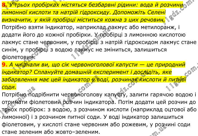 8. У трьох пробірках містяться безбарвні рідини: вода й розчини лимонної кислоти та натрій гідроксиду. Допоможіть Селені визначити, у якій пробірці міститься кожна з цих речовин. Потрібно взяти індикатор, наприклад лакмус або метилоранж, і додати його до кожної пробірки. У пробірці з лимонною кислотою лакмус стане червоним, у пробірці з натрій гідроксидом лакмус стане синім, у пробірці з водою лакмус не зміниться, залишиться фіолетовим. 9. А чи знали ви, що сік червоноголової капусти — це природний індикатор? Сплануйте домашній експеримент і дослідіть, яке забарвлення має цей індикатор у воді, розчинах кислоти й питної соди. Потрібно подрібнити червоноголову капусту, залити гарячою водою і отримати фіолетовий розчин індикатора. Потім додати цей розчин до трьох пробірок: з водою, з розчином кислоти (наприклад оцтової або лимонної) і з розчином питної соди. У воді індикатор залишиться фіолетовим, у кислоті стане червоним або рожевим, у розчині соди стане зеленим або жовто–зеленим.