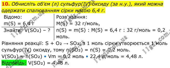 10. Обчисліть об'єм (л) сульфур(IV) оксиду (за н.у.), який можна одержати спалюванням сірки масою 6,4 г. Відомо: m(S) = 6,4 г Розв'язання: M(S) = 32 г/моль, n(S) = m(S) : M(S) = 6,4 г : 32 г/моль = 0,2 моль. Знайти: V(SO₂) – ? Рівняння реакції: S + O₂ → SO₂, з 1 моль сірки утворюється 1 моль сульфур(IV) оксиду, тому n(SO₂) = n(S) = 0,2 моль. V(SO₂) = n(SO₂) • Vm = 0,2 моль • 22,4 л/моль = 4,48 л. Відповідь: V(SO₂) = 4,48 л.