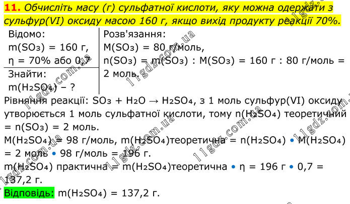 11. Обчисліть масу (г) сульфатної кислоти, яку можна одержати з сульфур(VI) оксиду масою 160 г, якщо вихід продукту реакції 70%. Відомо: m(SO₃) = 160 г, η = 70% або 0,7 Розв'язання: M(SO₃) = 80 г/моль, n(SO₃) = m(SO₃) : M(SO₃) = 160 г : 80 г/моль = 2 моль. Знайти: m(H₂SO₄) – ? Рівняння реакції: SO₃ + H₂O → H₂SO₄, з 1 моль сульфур(VI) оксиду утворюється 1 моль сульфатної кислоти, тому n(H₂SO₄) теоретичний = n(SO₃) = 2 моль. M(H₂SO₄) = 98 г/моль, m(H₂SO₄)теоретична = n(H₂SO₄) • M(H₂SO₄) = 2 моль • 98 г/моль = 196 г. m(H₂SO₄) практична = m(H₂SO₄)теоретична • η = 196 г • 0,7 = 137,2 г. Відповідь: m(H₂SO₄) = 137,2 г.