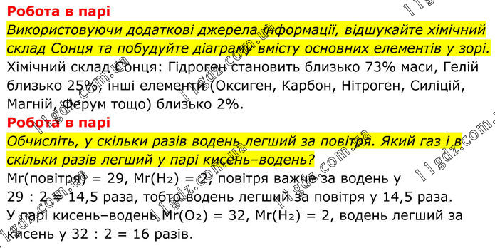 Робота в парі Використовуючи додаткові джерела інформації, відшукайте хімічний склад Сонця та побудуйте діаграму вмісту основних елементів у зорі. Хімічний склад Сонця: Гідроген становить близько 73% маси, Гелій близько 25%, інші елементи (Оксиген, Карбон, Нітроген, Силіцій, Магній, Ферум тощо) близько 2%. Робота в парі Обчисліть, у скільки разів водень легший за повітря. Який газ і в скільки разів легший у парі кисень–водень? Mr(повітря) = 29, Mr(H₂) = 2, повітря важче за водень у 29 : 2 = 14,5 раза, тобто водень легший за повітря у 14,5 раза. У парі кисень–водень Mr(O₂) = 32, Mr(H₂) = 2, водень легший за кисень у 32 : 2 = 16 разів.