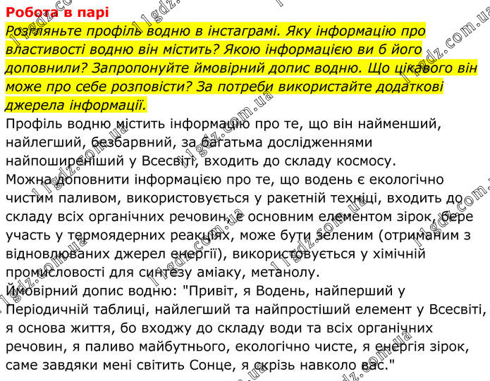 Робота в парі Розгляньте профіль водню в інстаграмі. Яку інформацію про властивості водню він містить? Якою інформацією ви б його доповнили? Запропонуйте ймовірний допис водню. Що цікавого він може про себе розповісти? За потреби використайте додаткові джерела інформації. Профіль водню містить інформацію про те, що він найменший, найлегший, безбарвний, за багатьма дослідженнями найпоширеніший у Всесвіті, входить до складу космосу. Можна доповнити інформацією про те, що водень є екологічно чистим паливом, використовується у ракетній техніці, входить до складу всіх органічних речовин, є основним елементом зірок, бере участь у термоядерних реакціях, може бути зеленим (отриманим з відновлюваних джерел енергії), використовується у хімічній промисловості для синтезу аміаку, метанолу. Ймовірний допис водню: "Привіт, я Водень, найперший у Періодичній таблиці, найлегший та найпростіший елемент у Всесвіті, я основа життя, бо входжу до складу води та всіх органічних речовин, я паливо майбутнього, екологічно чисте, я енергія зірок, саме завдяки мені світить Сонце, я скрізь навколо вас."