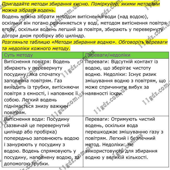 Пригадайте методи збирання кисню. Поміркуйте, якими методами можна зібрати водень. Водень можна зібрати методом витіснення води (над водою), оскільки він погано розчиняється у воді, методом витіснення повітря вгору, оскільки водень легший за повітря, збирають у перевернуту догори дном пробірку або циліндр. Розгляньте таблицю «Методи збирання водню». Обговоріть переваги та недоліки кожного методу. Суть методу Переваги/недоліки Витіснення повітря: Водень збирають у перевернуту посудину, яка спочатку заповнена повітрям. Газ виходить із трубки, витісняючи повітря з ємності, і наповнює її собою. Легкий водень піднімається знизу важким повітрям. Переваги: Відсутній контакт із водою, що зберігає чистоту водню. Недоліки: Існує ризик змішування водню з повітрям, що може спричинити вибух за наявності іскри. Витіснення води: Посудину (зазвичай це перевернутий циліндр або пробірка) попередньо заповнюють водою і занурюють у посудину з водою. Водень спрямовують у посудину, наповнену водою, за допомогою трубки. Переваги: Отримують чистий водень, оскільки вода перешкоджає змішуванню газу з повітрям. Легкий і безпечний метод. Недоліки: Не використовують для збирання водню у великій кількості.