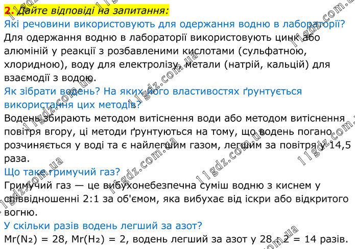 2. Дайте відповіді на запитання: Які речовини використовують для одержання водню в лабораторії? Для одержання водню в лабораторії використовують цинк або алюміній у реакції з розбавленими кислотами (сульфатною, хлоридною), воду для електролізу, метали (натрій, кальцій) для взаємодії з водою. Як зібрати водень? На яких його властивостях ґрунтується використання цих методів? Водень збирають методом витіснення води або методом витіснення повітря вгору, ці методи ґрунтуються на тому, що водень погано розчиняється у воді та є найлегшим газом, легшим за повітря у 14,5 раза. Що таке гримучий газ? Гримучий газ — це вибухонебезпечна суміш водню з киснем у співвідношенні 2:1 за об'ємом, яка вибухає від іскри або відкритого вогню. У скільки разів водень легший за азот? Mr(N₂) = 28, Mr(H₂) = 2, водень легший за азот у 28 : 2 = 14 разів.