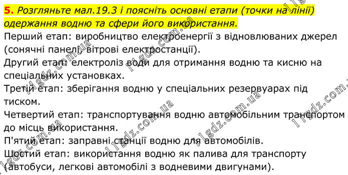 5. Розгляньте мал.19.3 і поясніть основні етапи (точки на лінії) одержання водню та сфери його використання. Перший етап: виробництво електроенергії з відновлюваних джерел (сонячні панелі, вітрові електростанції). Другий етап: електроліз води для отримання водню та кисню на спеціальних установках. Третій етап: зберігання водню у спеціальних резервуарах під тиском. Четвертий етап: транспортування водню автомобільним транспортом до місць використання. П'ятий етап: заправні станції водню для автомобілів. Шостий етап: використання водню як палива для транспорту (автобуси, легкові автомобілі з водневими двигунами).