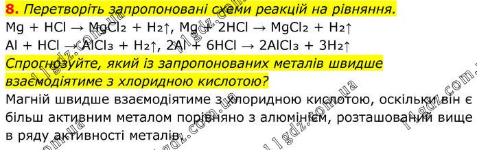 8. Перетворіть запропоновані схеми реакцій на рівняння. Mg + HCl → MgCl₂ + H₂↑, Mg + 2HCl → MgCl₂ + H₂↑ Al + HCl → AlCl₃ + H₂↑, 2Al + 6HCl → 2AlCl₃ + 3H₂↑ Спрогнозуйте, який із запропонованих металів швидше взаємодіятиме з хлоридною кислотою? Магній швидше взаємодіятиме з хлоридною кислотою, оскільки він є більш активним металом порівняно з алюмінієм, розташований вище в ряду активності металів.