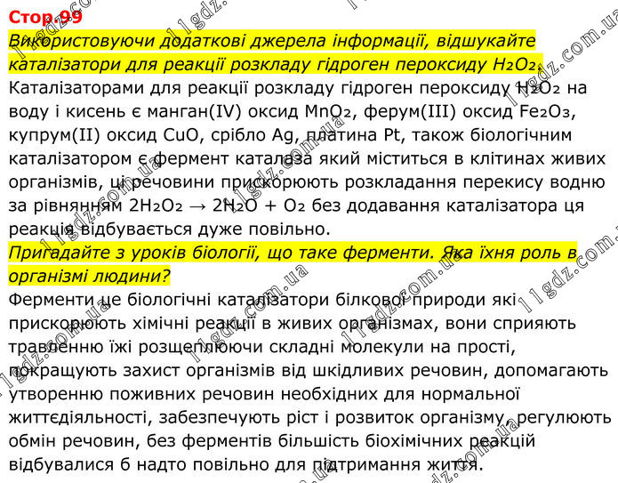 Стор.99 Використовуючи додаткові джерела інформації, відшукайте каталізатори для реакції розкладу гідроген пероксиду H₂O₂. Каталізаторами для реакції розкладу гідроген пероксиду H₂O₂ на воду і кисень є манган(IV) оксид MnO₂, ферум(III) оксид Fe₂O₃, купрум(II) оксид CuO, срібло Ag, платина Pt, також біологічним каталізатором є фермент каталаза який міститься в клітинах живих організмів, ці речовини прискорюють розкладання перекису водню за рівнянням 2H₂O₂ → 2H₂O + O₂ без додавання каталізатора ця реакція відбувається дуже повільно. Пригадайте з уроків біології, що таке ферменти. Яка їхня роль в організмі людини? Ферменти це біологічні каталізатори білкової природи які прискорюють хімічні реакції в живих організмах, вони сприяють травленню їжі розщеплюючи складні молекули на прості, покращують захист організмів від шкідливих речовин, допомагають утворенню поживних речовин необхідних для нормальної життєдіяльності, забезпечують ріст і розвиток організму, регулюють обмін речовин, без ферментів більшість біохімічних реакцій відбувалися б надто повільно для підтримання життя.