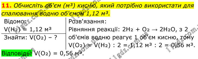 11. Обчисліть об'єм (м³) кисню, який потрібно використати для спалювання водню об'ємом 1,12 м³. Відомо: V(H₂) = 1,12 м³ Розв'язання: Рівняння реакції: 2H₂ + O₂ → 2H₂O, з 2 об'ємів водню реагує 1 об'єм кисню, тому V(O₂) = V(H₂) : 2 = 1,12 м³ : 2 = 0,56 м³. Знайти: V(O₂) – ? Відповідь: V(O₂) = 0,56 м³.