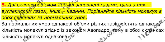5. Дві склянки об'ємом 200 мл заповнені газами, одна з них — вуглекислим газом, інша – чадним. Порівняйте кількість молекул в обох склянках за нормальних умов. За нормальних умов однакові об'єми різних газів містять однакову кількість молекул згідно із законом Авогадро, тому в обох склянках кількість молекул однакова.