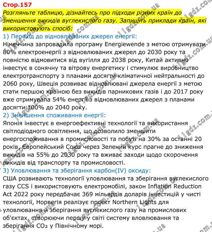 Розгляньте таблицю, дізнайтесь про підходи різних країн до зменшення викидів вуглекислого газу. Запишіть приклади країн, які використовують спосіб: 1) Перехід до відновлюваних джерел енергії: Німеччина запровадила програму Energiewende з метою отримувати 80% електроенергії з відновлюваних джерел до 2030 року та повністю відмовитися від вугілля до 2038 року, Китай активно інвестує в сонячну та вітрову енергетику і стимулює виробництво електротранспорту з планами досягти кліматичної нейтральності до 2060 року, Швеція розвиває відновлювані джерела енергії з метою стати першою країною без викидів парникових газів і до 2017 року вже отримувала 54% енергії з відновлюваних джерел з планами досягти 100% до 2040 року. 2) Зменшення споживання енергії: Японія інвестує в енергоефективні технології та використання світлодіодного освітлення, що дозволило зменшити енергоспоживання в промисловості та побуті на 30% за останні 20 років, Європейський Союз через Зелений курс прагне до зниження викидів на 55% до 2030 року та вживає заходи щодо скорочення викидів від транспорту та промисловості. 3) Уловлювання та зберігання карбон(IV) оксиду: США розвивають технології уловлювання та зберігання вуглекислого газу CCS і використовують електромобілі, закон Inflation Reduction Act 2022 року передбачає 369 мільярдів доларів інвестицій у чисті технології, Норвегія реалізує проєкт Northern Lights для уловлювання й зберігання вуглекислого газу на промислових об'єктах, створюючи першу у світі систему вловлювання та зберігання CO₂ у Північному морі.